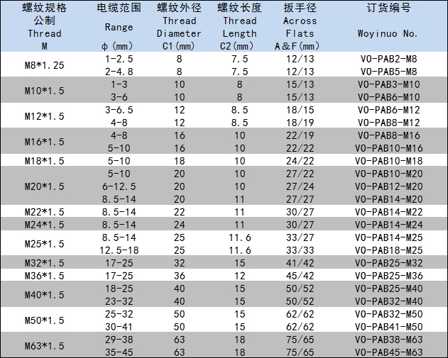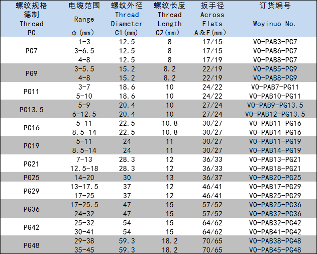 使用方法:VO-PAB型尼龍電纜接頭是電纜的配套產品,接頭可將電纜鎖緊,另一端可接入設備箱體上,也可以根據選用螺紋,接入進出口為內螺紋的電動設備上。