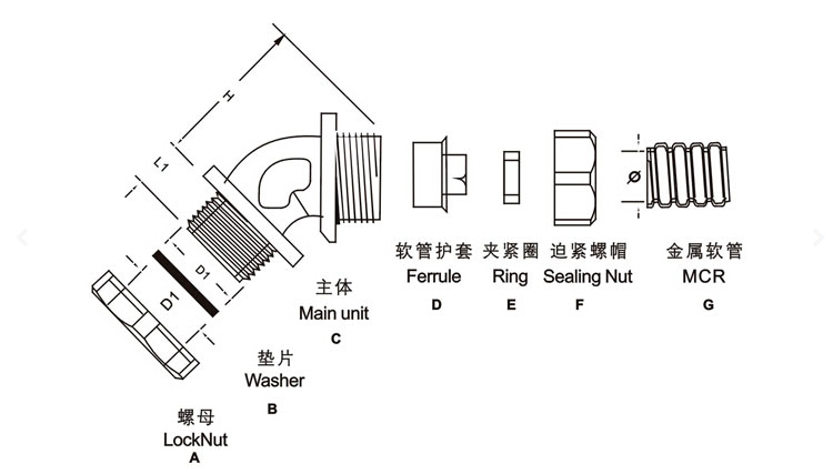 加厚型鋅合金鍍鋅或鍍硬鉻,外形美觀,結構緊密,強度高;軟管護套設計與軟管相扣接緊之設計,配合迫緊頭裝配省時便利,抗拉力特強;可防水、防塵、抗鹽、耐酸堿及一般溶劑;除以下標準規格以外,可另按需求任意變動大小及螺紋標準。